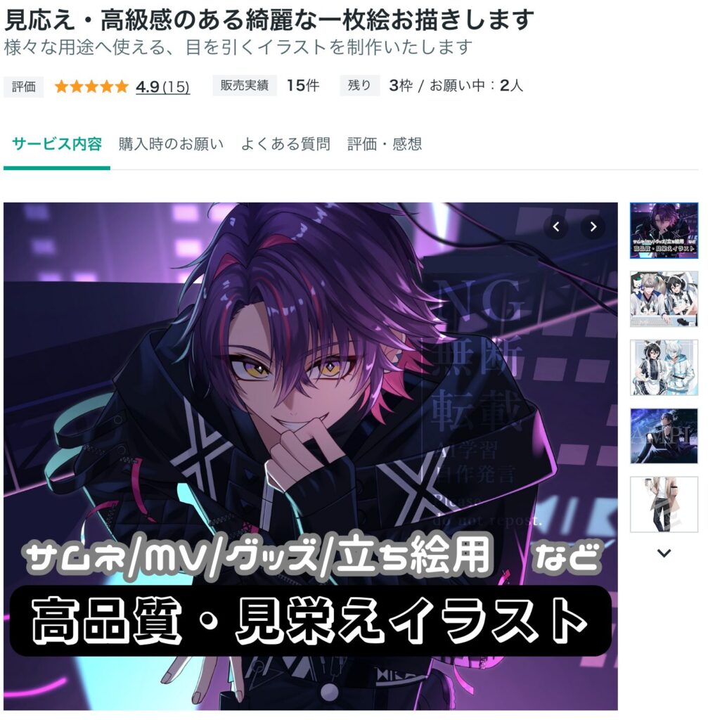 3つ目は、依頼者にやりすぎなくらい丁寧に対応するようにしてきたことだと思います。本当に少しの言葉遣いでも大きく印象が変わったりするので、AIなどにも頼りながら、なるべく完璧な言葉遣いと迅速な返信を心がけていました。また、依頼者からの要望をそのまま描くのではなく、「こういった構図などはどうですか?」というような提案も行って、求められる以上の対応が出来るように意識していました。
