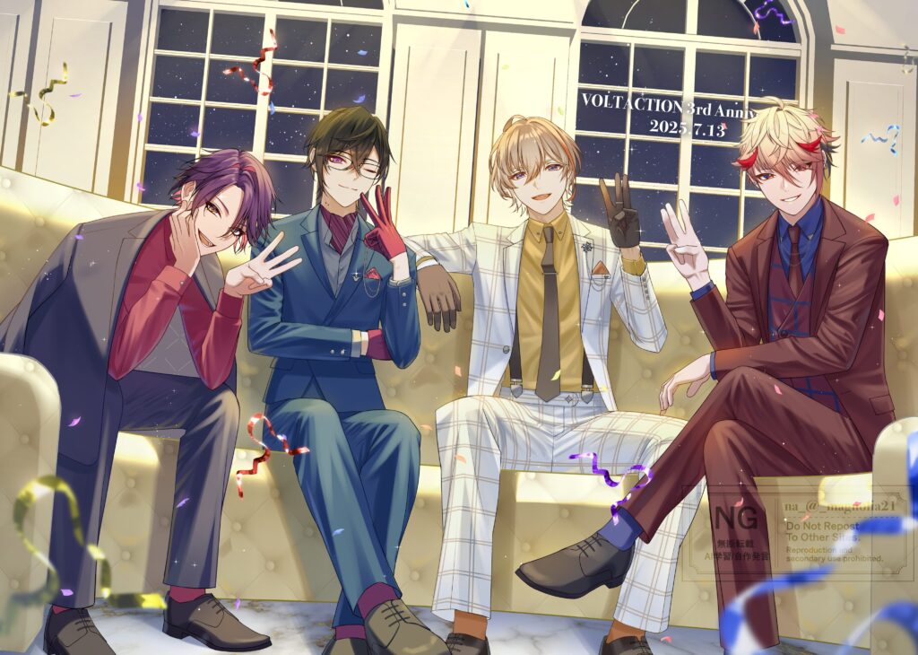 この最新作品は、推しのVTuberグループの3周年をお祝いしたイラストです。パーティ感を出すために暖色の光を取り入れたり、紙テープやキラキラを舞わせたりしました。背面は最初は一面壁の予定だったのですが、暖色の雰囲気を目立たせるために夜空の深い青を入れることでメリハリをつけたり、高級感を出すために大きな窓を取り入れたりしました。