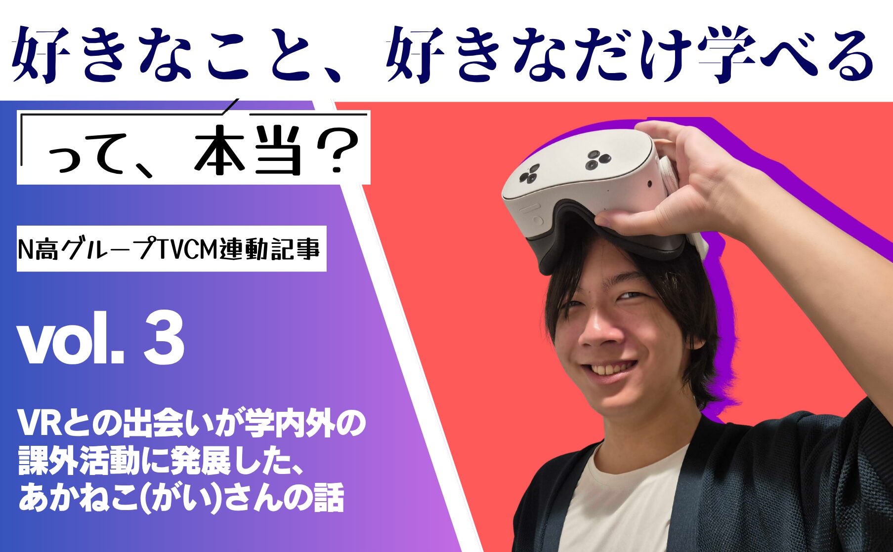 今回は、N高入学後に出会った「好き」を学内外での課外活動に発展させたあかねこ(がい)さんをお呼びし、「好きなこと、好きなだけ学べる」とはどんなことかというテーマのもと、学園とVRにちなんだ対話の様子をお届けします!