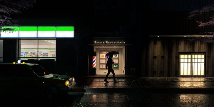 雨の日の夜の静かなワンシーンを3DCGで表現した作品。