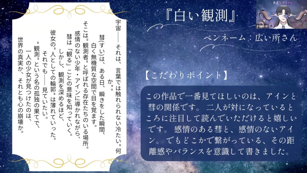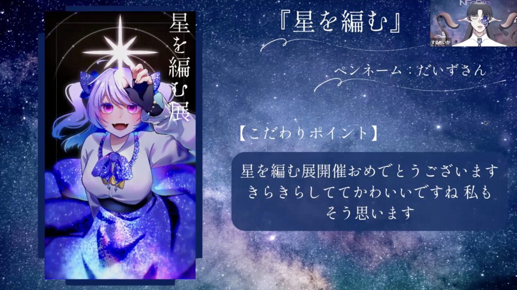 「星を編む展」は、事前に募集されたイラストや短編小説をMCと一緒に鑑賞する企画。ゆったりとしたBGMが流れる空間で、MCが穏やかな声で作品を紹介してくれます。作品はどれも宇宙や星をテーマにしたもので、まるで宇宙を旅しているような気分です。