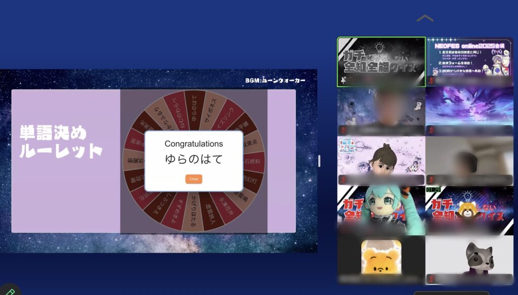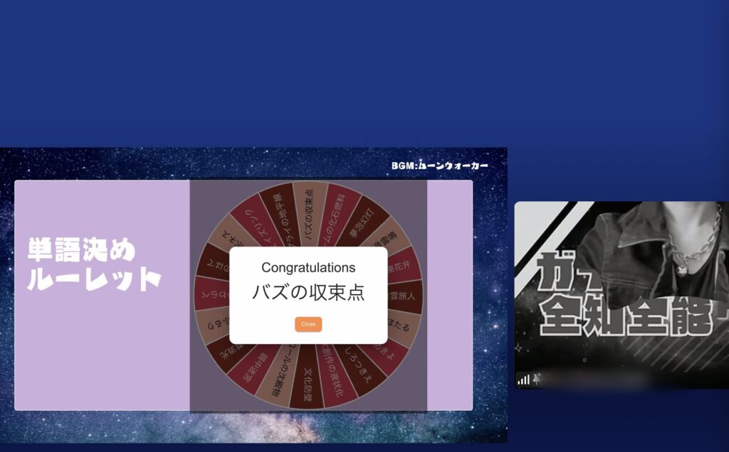 用意された20もの存在しない言葉から、ルーレットで1語が表示されます。チャットで立候補した参加者が順番に話者となり、表示された言葉の意味や背景を知ったかぶりで解説。zoomの投票機能で観客による投票を行い、最も多く票を集めた話者が勝者となります。
