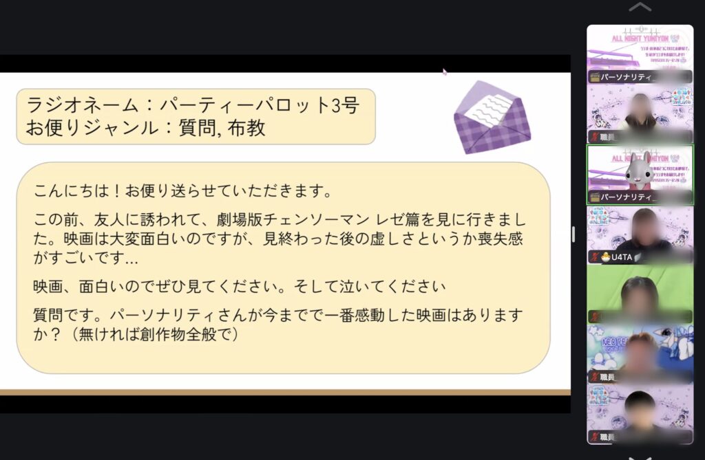 私が参加したラジオルームでは、事前に募集されたお便りをパーソナリティが紹介していきます。参加者に質問を投げかけたり、zoomのチャットを拾ったりと、パーソナリティのほうから参加者を巻き込んでくれました。ゆったりしたBGMとともに作業のお供にしても、チャットでガッツリ参加しても楽しめる企画でした。