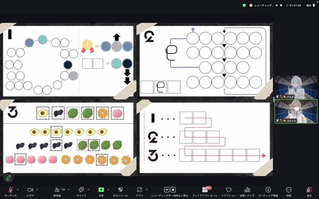 zoomの画面いっぱいに謎解きが表示され、参加者がチャットで知恵を出し合いながら解いていきます。未来からやってきた二人も交えて雑談も盛り上がります。参加者と交流しつつ、アイデアを出し合って謎を解くというのには、新鮮な楽しさがありました。