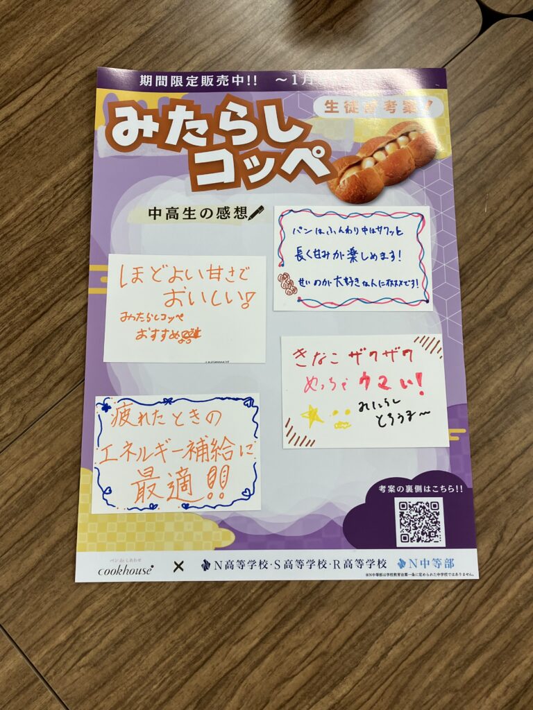 今回商品化された「みたらしコッペ」は、卜部 仁(うらべ じん)さん(S高等学校2年)、小林 建登(こばやしけんと)さん(N高等学校1年)、津川 眞梨子(つがわ まりこ)さん(N高等学校1年)、東本 杏樹(ひがしもと あんじゅ)さん(N中等部2年)の4名が、ワークショップを通じて考案した商品です。