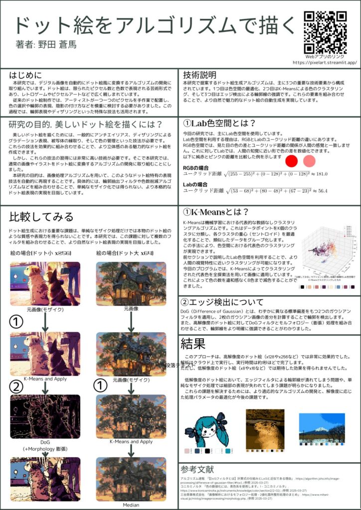 また、研究活動をポスターにまとめてわかりやすく発表する力も身につきました。普通のプレゼンとは異なり、1枚で内容を理解してもらえるように構成するのが難しく、制作には2週間ほどかかりました。ポスター内の文章とグラフのバランスを考えるのも大変でした。