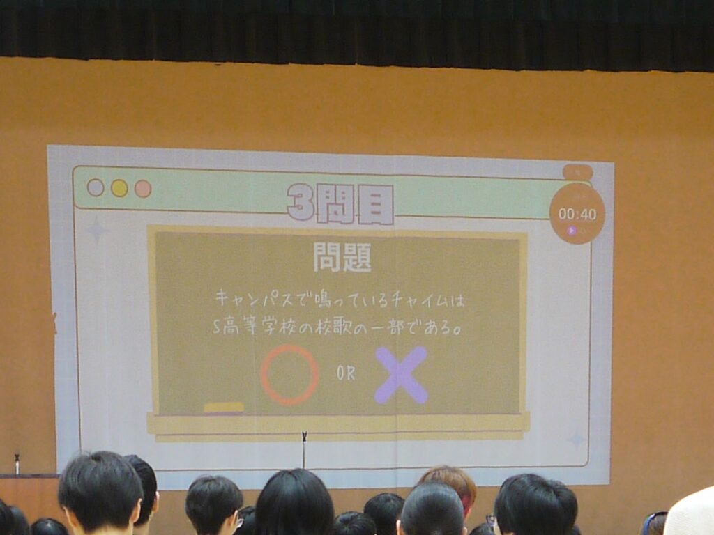 特に面白かったのが、「キャンパスで鳴っているチャイムの曲はS高等学校の校歌である、◯か×か」という問題。