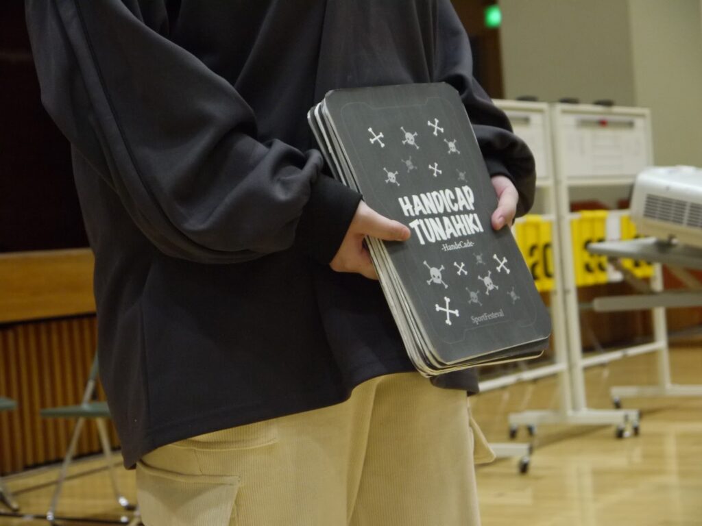 下の画像のようなハンデカードを用いて、各チームそれぞれのハンデを背負いながら綱引きをするという特別ルールがあり、このハンデを守らないと失格になってしまいます。