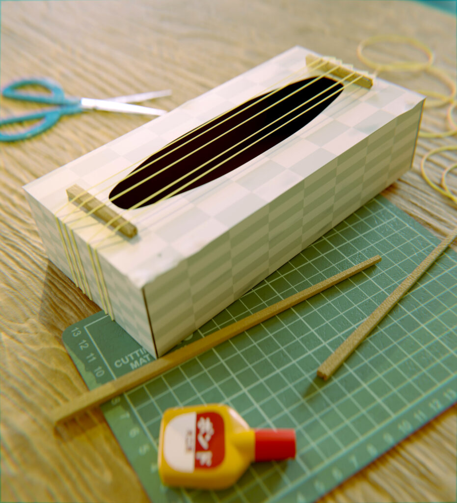 その作品を応募したのが、テーマ発表から23時間以内に作品を作って競うというコンテストです。僕が選択したテーマが「幼い頃の思い出」でした。思い出に関するテーマが3つくらいあって、その中で僕は楽器なのかな? あまり覚えてないのですがこの作品のテーマを選択しました。よく小学生の頃にティッシュの空箱に輪ゴムをつけて「ギター!🎸」とか言って遊んでいたのを思い出して、それを作ろうと思って。それだと23時間以内で作れそうだったので作りました。