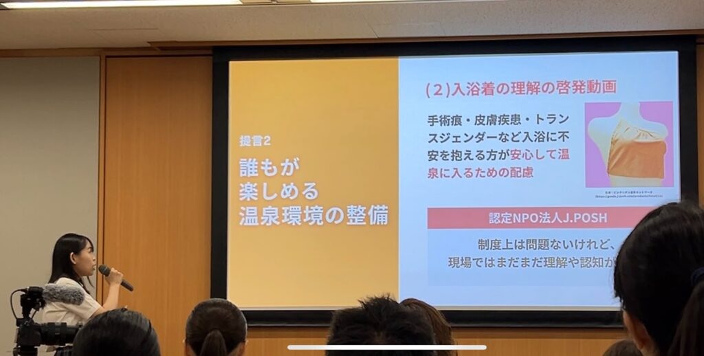 また、群馬県の高校生リバースメンター(※1)として県庁や環境省と連携し、温泉に関する政策の提言も行っています。具体的には「湯治文化の発信」や「入浴着の理解促進」などを提言しました。