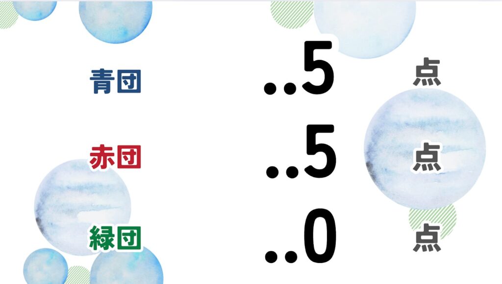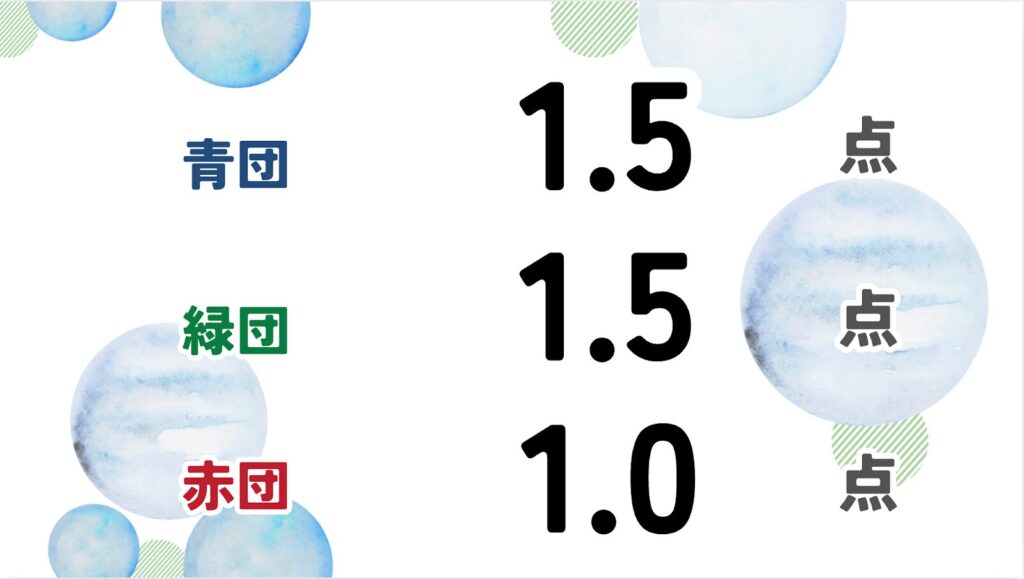 「からす」「すずめ」「かもめ」全然ダメです。若干語感は似てますが何も揃ってませんね。これには外で見守っている青団のメンバーも半分呆れています。最終的には緑団が勝利し、30ポイントを獲得しました。緑団は初の種目1位を獲得することができました。