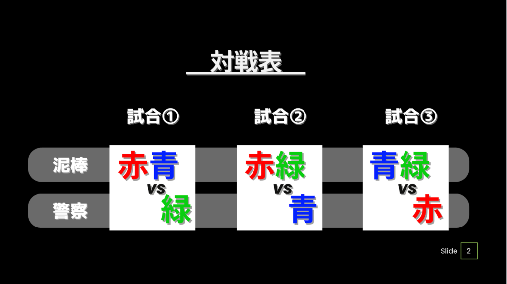 早速試合がスタートしました。緑団が必死に泥棒を追いかけています。