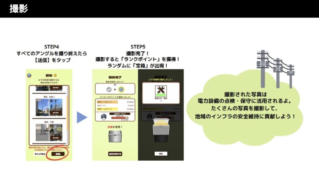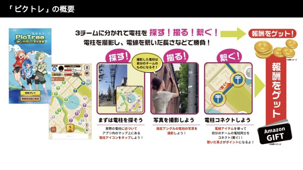 スマホで街中の電柱やマンホールなどの電力・通信設備を撮影し、チームでその数や距離を競う「参加型社会貢献ゲーム」です。撮影データはインフラの保全に活用され、ゲームを通じて報酬を得られる仕組みで、ポイ活と地域貢献を両立しています。